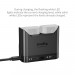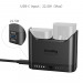 Each charging channel features five LED indicators that display power levels in 20% increments, even without external power. A red warning light activates when battery levels are critically low. Additionally, the charger incorporates a universal USB-C input port and comes with a fast-charging cable, making it compatible with wall adapters, car chargers, and power banks for versatile charging options.