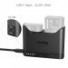 Each charging channel features five LED indicators that display power levels in 20% increments, even without external power. A red warning light activates when battery levels are critically low. Additionally, the charger incorporates a universal USB-C input port and comes with a fast-charging cable, making it compatible with wall adapters, car chargers, and power banks for versatile charging options.