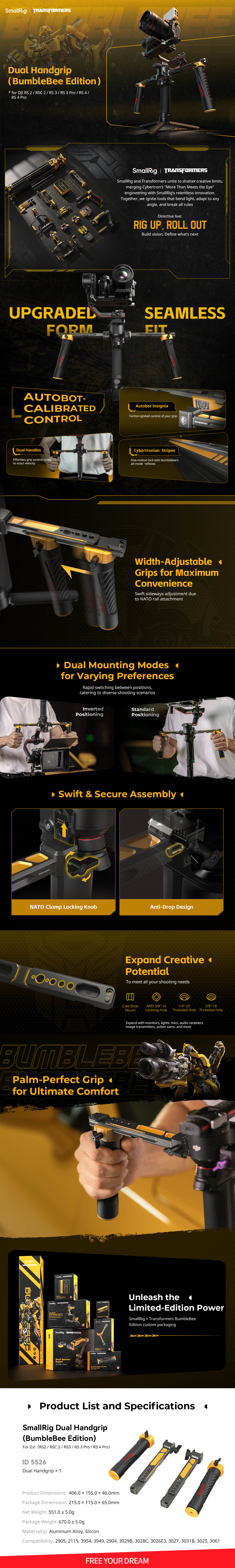 SmallRig Dual Handgrip for DJI RS 2 / RSC 2 / RS 3 / RS 3 Pro / RS 4 / RS 4 Pro (BumbleBee Edition) 5526 is designed to reduce arm fatigue during shooting and provide rich accessories mounts. It secures to the NATO rail on each side of the gimbal, easy for detachment and time-saving. The handgrip is designed with two-side NATO rails, which is not only horizontal adjustable, but also easy for detachment and support shooting in inverted mode. Built-in multiple 1/4”-20 and ARRI 3/8”-16 threaded holes can attach Magic Arm 2115 for monitor. Cold shoe ports can be used for Monitor Mount 2905, wireless go, microphone, sound receiver, etc. It disassembles into four part for easy storage and transport.