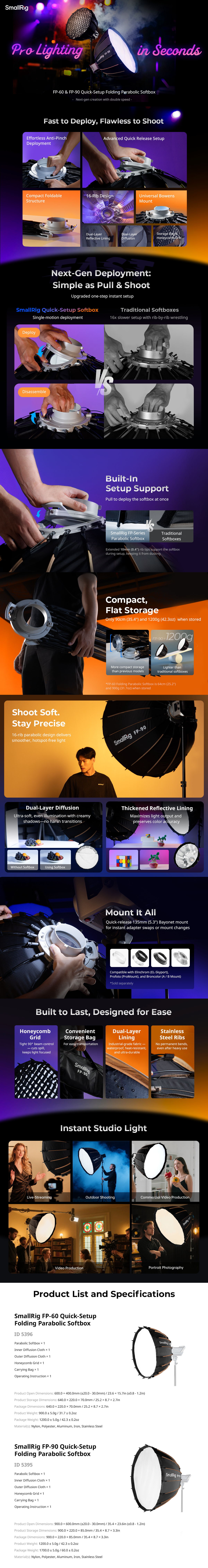 SmallRig FP-60 Quick-Setup Folding Parabolic Softbox 5396 features a universal Bowens mount, ensuring compatibility with the SmallRig RC 220 Pro series and other Bowens-mount light sources on the market. Its innovative quick release umbrella structure enables effortless one-step setup and disassembly, streamlining operations for users.