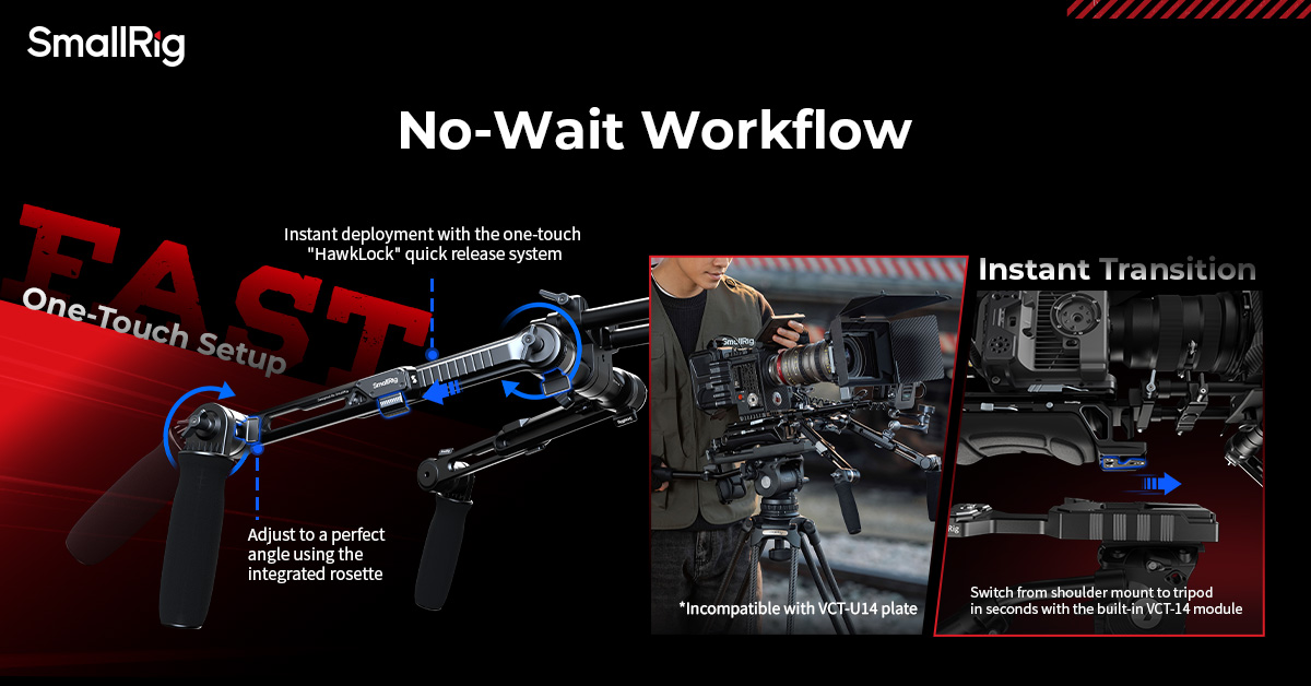 Rapid Setup & Workflow: The built-in VCT module enables one-second transitions between shoulder and tripod modes. Tool-free assembly and one-touch telescopic arm deployment facilitate efficient on-set adjustments.
