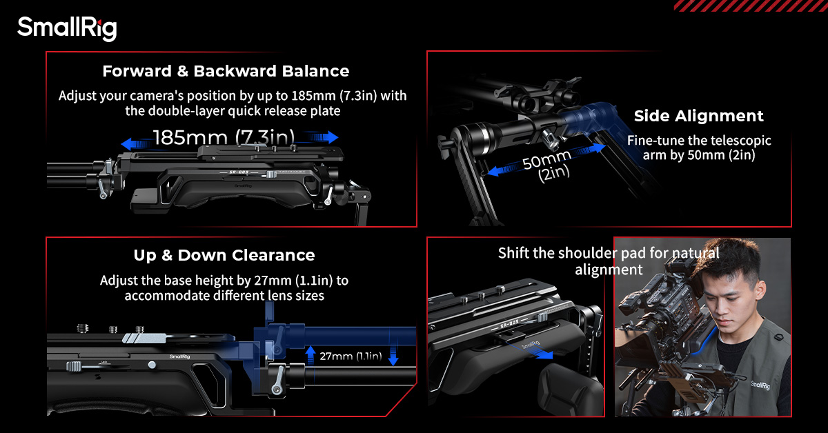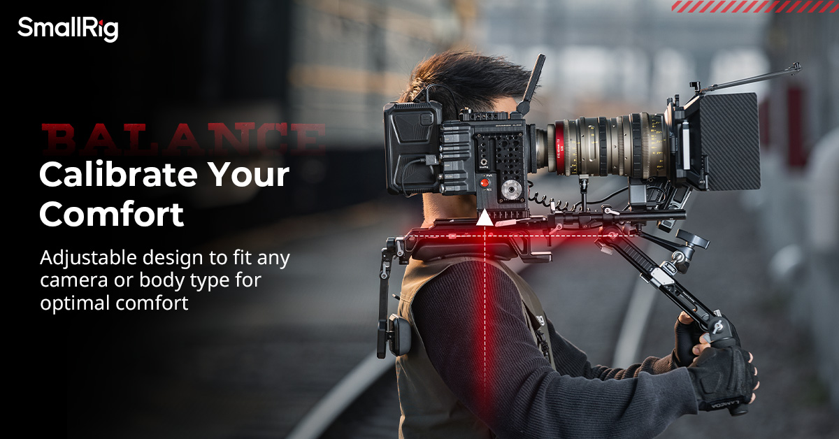 Ergonomic Design for Extended Shooting: The telescopic arm adjusts 50mm (2in) laterally to fit photographers of different sizes. The wide, thickened, and laterally adjustable shoulder pad ensures comfort without obstructing your view. The adaptive back pad provides additional safety during low-angle shots.