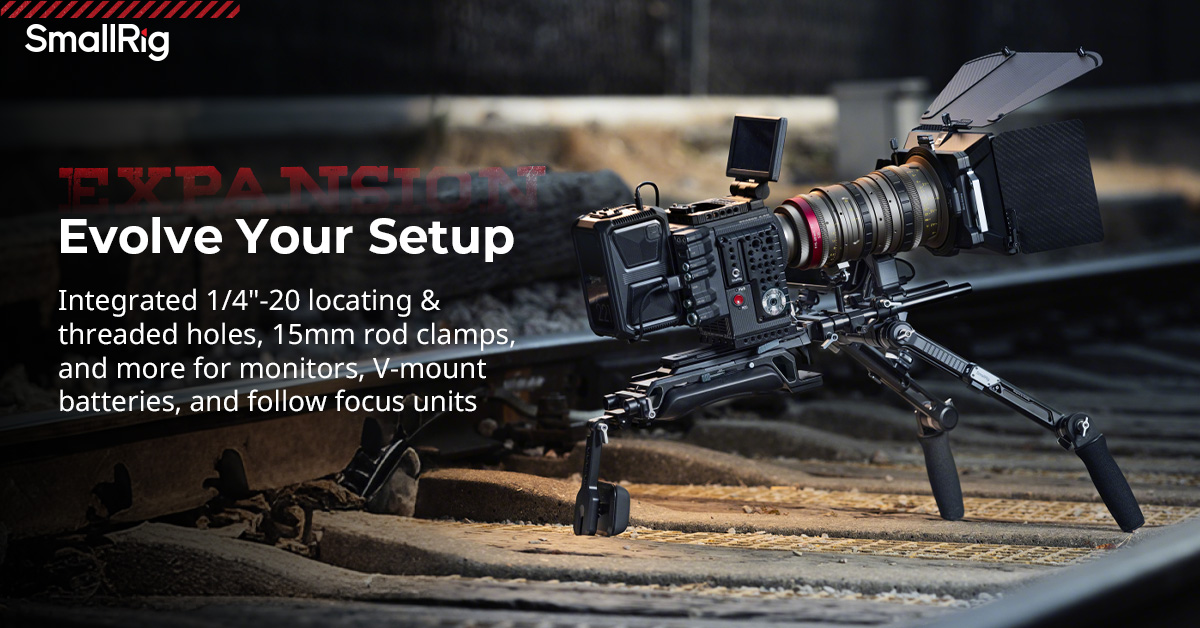 Versatile Mounting Options for Rich Expansion: Multiple mounting points—including 1/4"-20 locating holes, 1/4"-20 threaded holes, and 15mm rod clamps—enable the mounting of accessories like monitors, V-mount batteries, and follow focus systems.