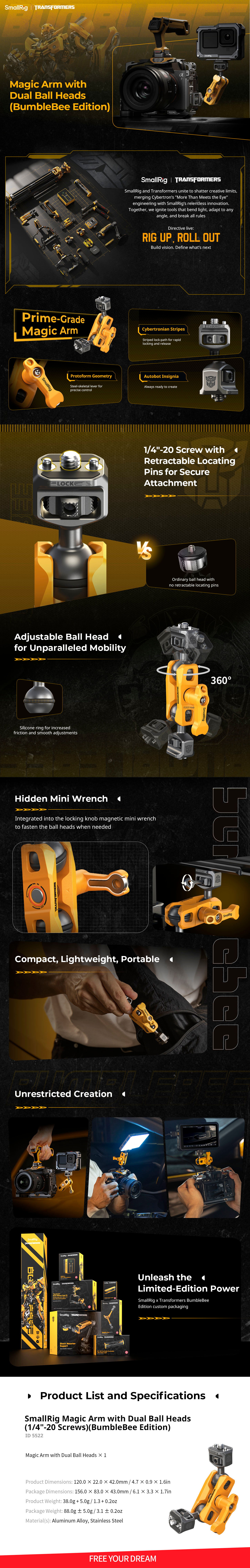 SmallRig Magic Arm Support with Dual Ball Heads (1/4”-20 Screws) (BumbleBee Edition) 5522 is compact and lightweight. Each ball head, 20mm in diameter, features one 1/4 "-20 screw and stretchable pins that prevent twisting. The adjustable thumb lever helps secure ball head at an appropriate angle and comes with a small magnetic wrench at the bottom to tighten the thumbwheels. At both ends of the ball head clamp there are notches which leave more space for flexible adjustment of ball heads as well as accessories mounted thereon. This item weighs only 88g, making it easy to carry around and store.