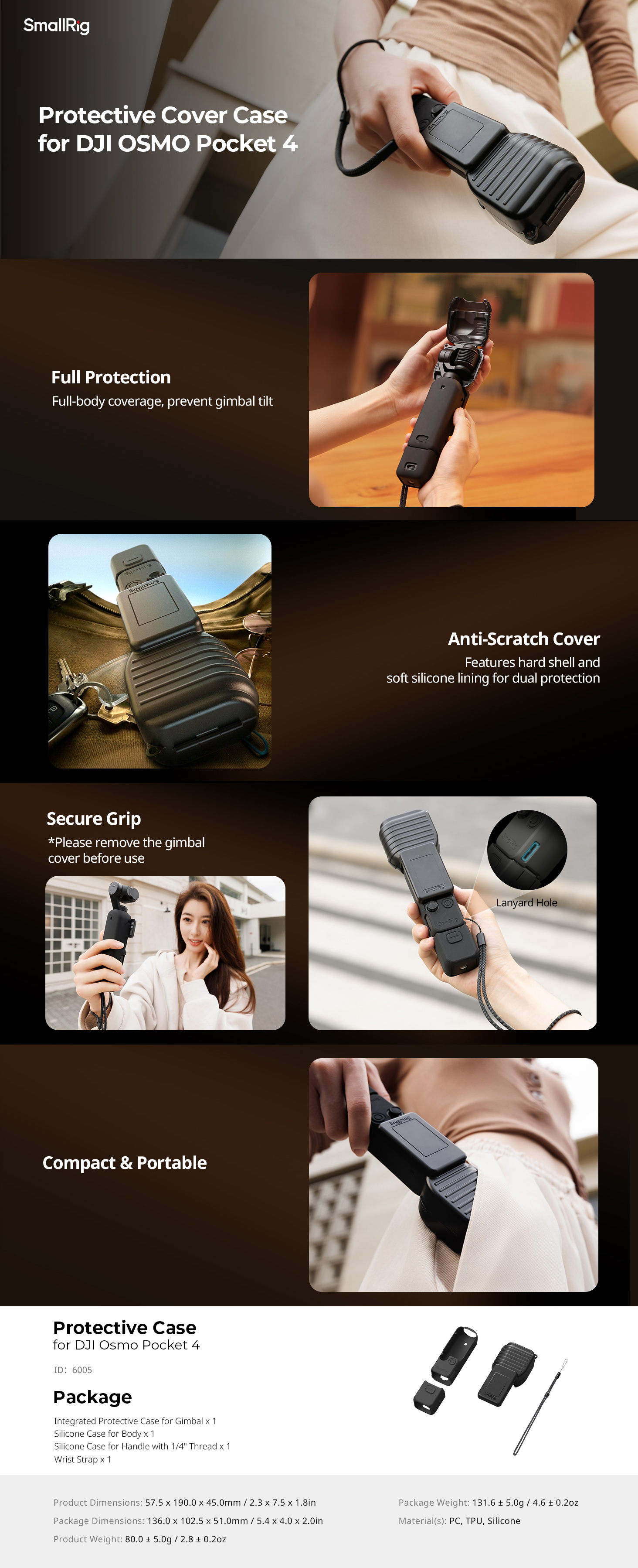 SmallRig Protective Case Kit for DJI Osmo Pocket 4 6005 provides a dedicated storage and protection solution for your camera. The kit includes an integrated gimbal case, a silicone case for the body, a silicone case for the threaded handle, and a wrist strap. Each case is precision-molded for a perfect fit that does not interfere with buttons or ports.