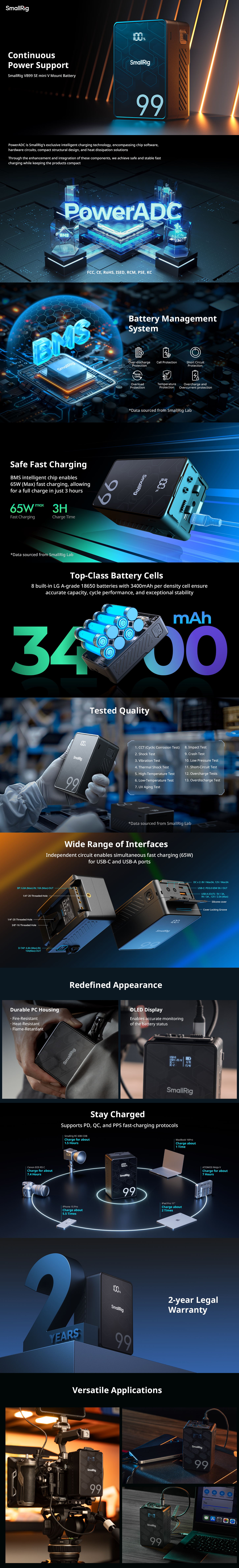 SmallRig VB99 SE mini V Mount Battery 4608 is a compact V-mount battery featuring a highly integrated design that effectively reduces the battery's overall size, making it lightweight and portable. It features LG A-grade 18650 high-rate cells, ensuring accurate capacity, cycle performance, and exceptional stability. Designed to meet international standards such as MSDS / UN38.3 / IEC 62133 / UL2054 / UL 62368, it has obtained certifications including FCC / CE / RoHS / ISED / RCM / PSE / KC, ensuring safe and reliable operation for users. The battery is equipped with a BP, a D-Tap, an 8V-OUT DC, a 12V-OUT DC, a USB-C, and USB-A ports offering a wide range of interfaces for powering multiple devices simultaneously. This includes cameras, mirrorless cameras, monitors, transmitters, video lights, smartphones, tablets, laptops, and more, providing integrated and efficient power supply for all your needs. The battery features a highly integrated fast-charging protocol chip, MCU, boost/buck control chip, and Battery Management System (BMS), offering multiple protections including overcurrent, short circuit, over-temperature, and over-voltage. Additionally, it supports various fast-charging protocols such as PD, QC, and PPS, and enables 65W USB-C bi-directional PD fast charging. The battery exterior is made of fire-resistant PC material, heat-resistant, and flame-retardant, ensuring durability. It features an OLED screen that clearly displays battery level, remaining usage time, voltage, power, and other information, allowing you to accurately monitor the battery status. Featuring a suite of robust safety features, this device instills the confidence to capture every memorable moment with precision and reliability.