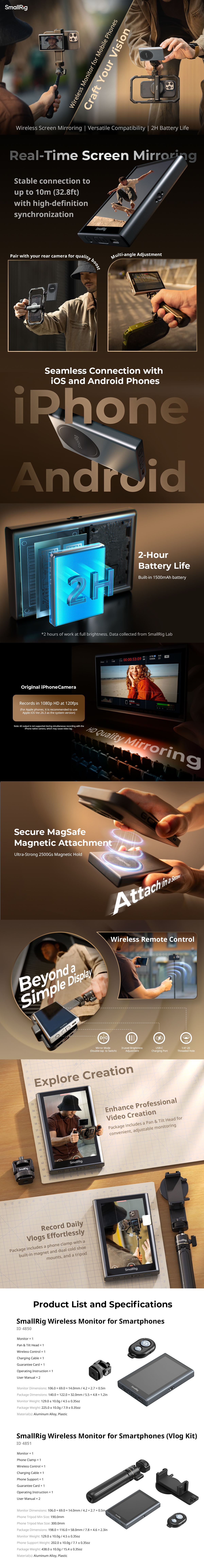 SmallRig Wireless Video Monitor for Phone (Vlog Kit) 4851B offers a screen mirroring solution for mobile content creation. The product features a mobile phone monitor, phone support, wireless remote controller, charging cable, and other accessories. The monitor can be mounted to the phone using the included phone support and other adapter accessories, or magnetically attached to iPhones or phones with magnetic rings, offering versatility. During taking selfies or using the rear camera of the phone, the monitor can display a real-time mirror image of the mobile camera view.